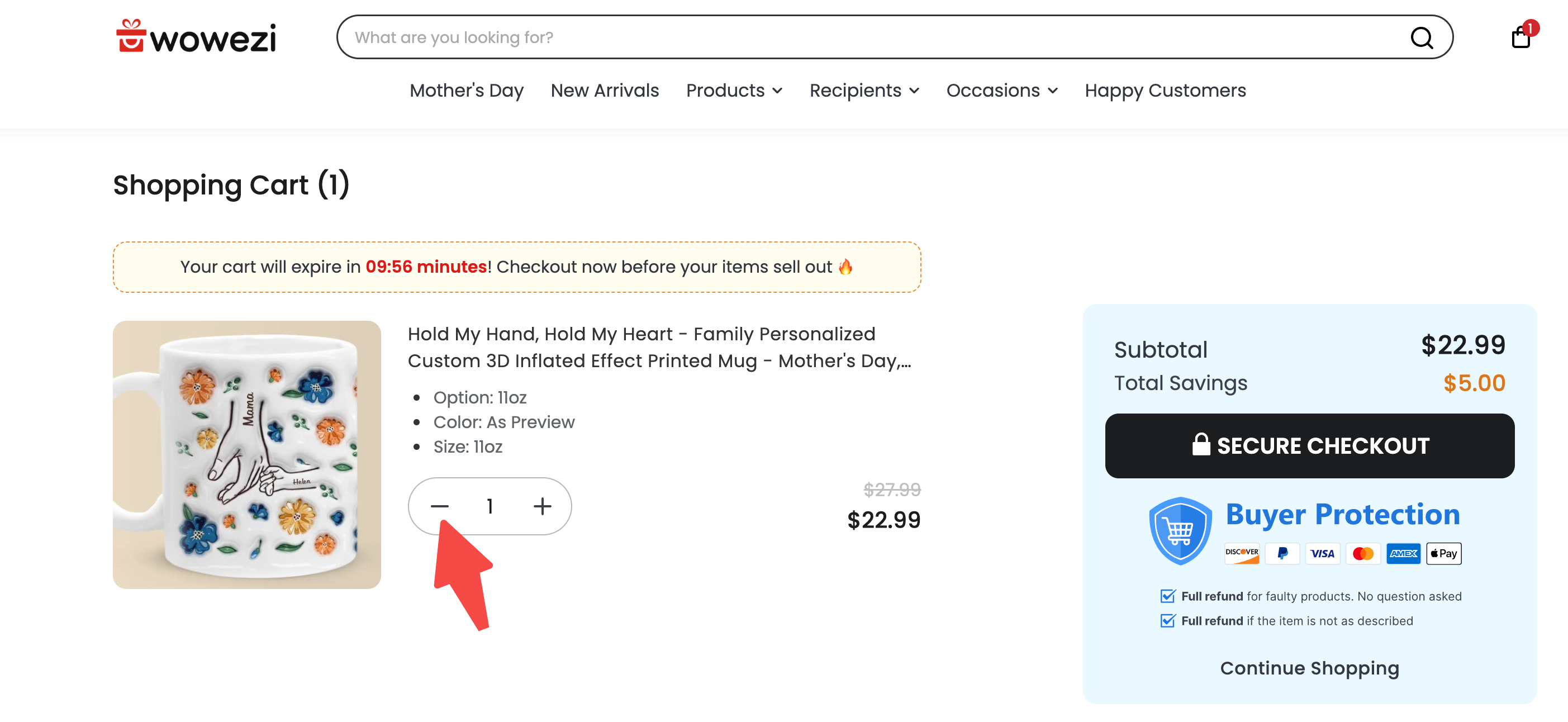 2) Find the item you want to remove and click on the minus ("-") button next to the quantity field to reduce the quantity.